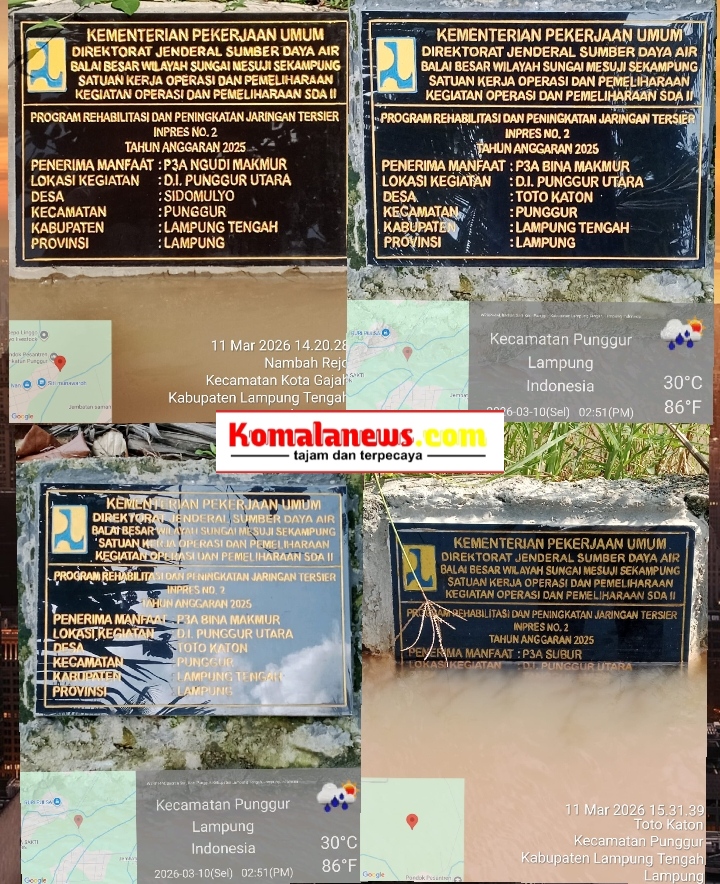 Kepada pihak yang berkeponten seperti wakil rakyat dan pihak BBWS agar dapat turun ke lapangan untuk melihat langsung hasil proyek inpres 2 tahun 2025 yang ada di tiga Kecamatan Kabupaten Lampung Tengah, supaya para pelaksana proyek irigasi tersier dapat dibenahi, supaya benar-benar dapat digunakan dalam waktu yang panjang. (Tim-Red)