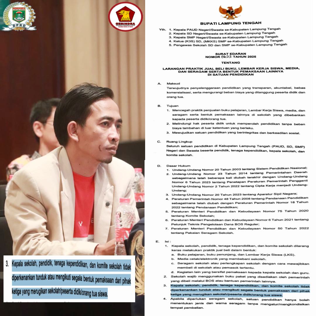 Hal tersebut tertuang dalam Surat Edaran Bupati Lampung Tengah dengan Nomor 0622 Tahun 2025 tentang Larangan Praktik Jual Beli Buku, Lembar Kerja Siswa, Media, Dan Seragam Serta Bentuk Pemaksaan Lainnya di Satuan Pendidikan.