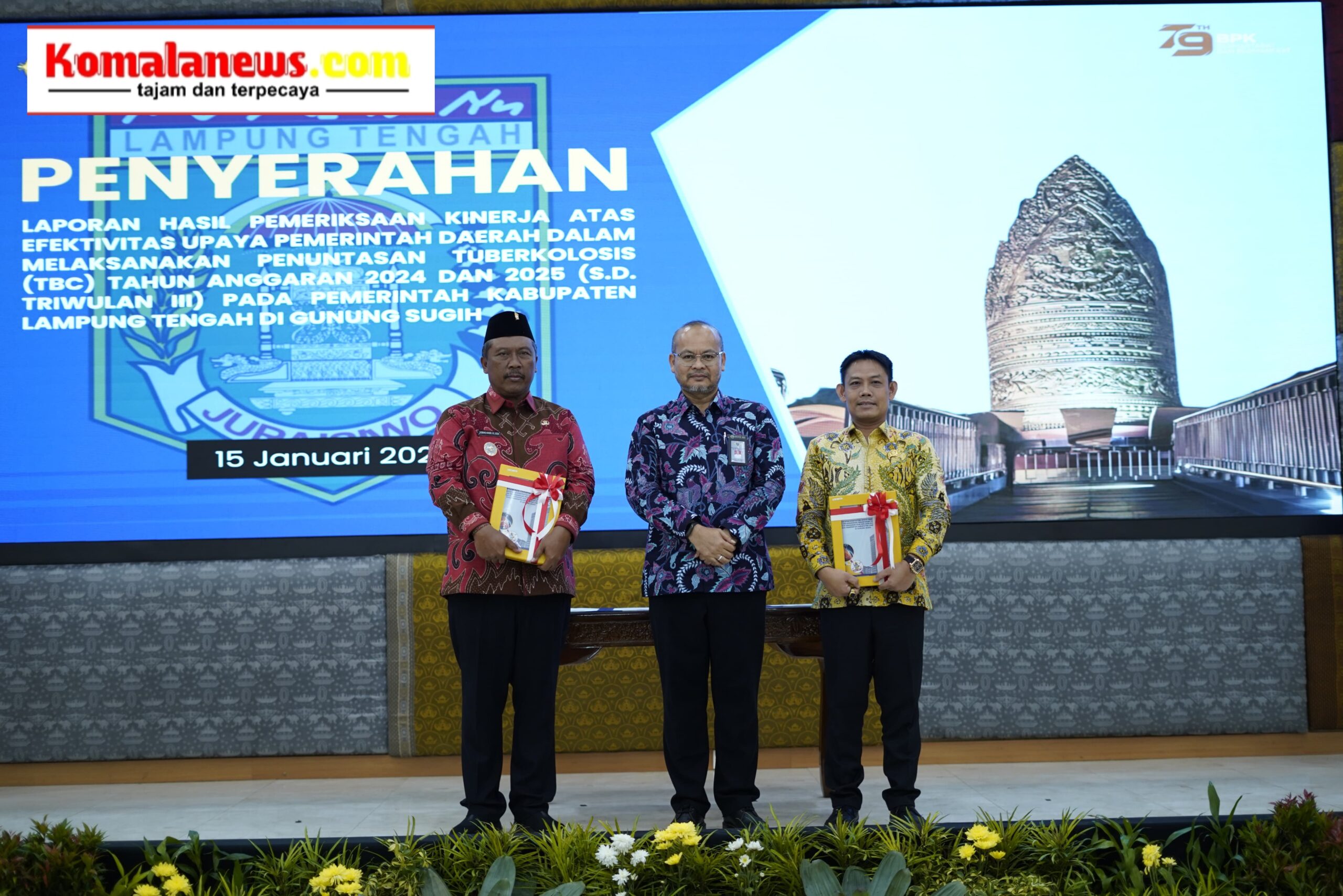 LAMPUNG TENGAH – (KomalaNews.com) – Pelaksana Tugas (Plt) Bupati Lampung Tengah, I Komang Koheri, bersama Ketua DPRD Kabupaten Lampung Tengah, Febriyantoni, menerima Laporan Hasil Pemeriksaan (LHP) dari Badan Pemeriksa Keuangan Republik Indonesia (BPK RI) Perwakilan Provinsi Lampung terkait kinerja atas efektivitas upaya pemerintah daerah dalam melaksanakan penuntasan tuberkulosis (TBC) Tahun Anggaran 2024 dan 2025 sampai dengan Triwulan II.