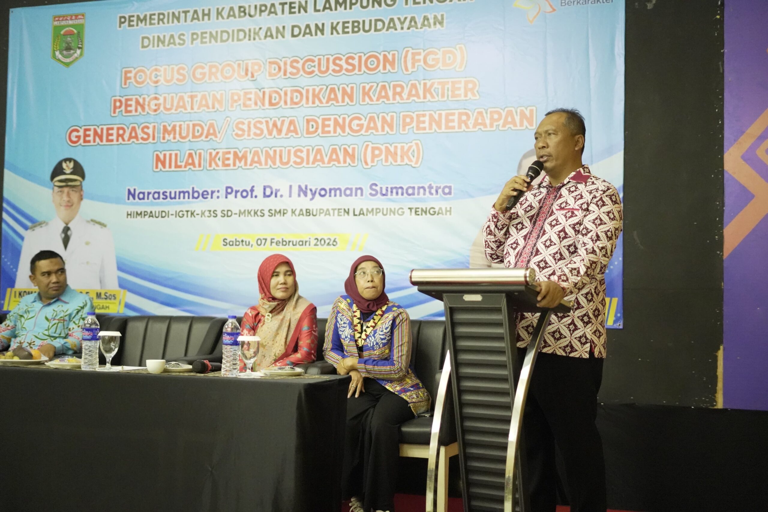 LAMPUNG TENGAH – (KomalaNews.com) – Pelaksana Tugas (Plt) Bupati Lampung Tengah, I. Komang Koheri, S.E., M.Sos., menyampaikan apresiasi dan dukungan penuh atas terselenggaranya kegiatan Focus Group Discussion (FGD) Penguatan Pendidikan Karakter Generasi Muda/Siswa melalui Penerapan Nilai Kemanusiaan (PNK) yang berlangsung di Hotel BBC, Bandar Jaya, Sabtu (7/2/2026).